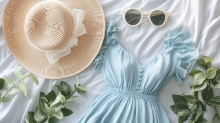 A fashion flat lay featuring a light blue dress, white sunglasses, and a straw hat, perfect for a summer day.