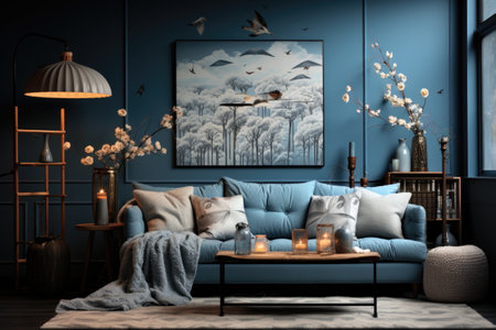 home interior blue with originally decorated walls and upholstered furniture