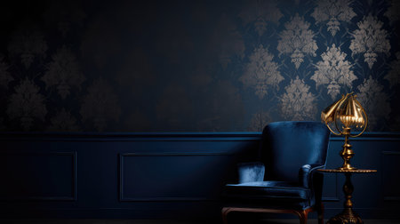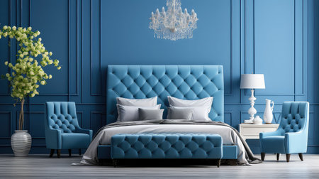 Classic blue interior with blue walls, wooden floor and classic armchairs. 3d rendering