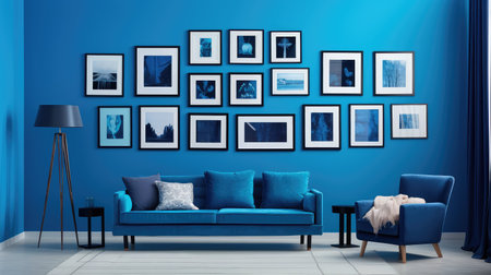 modern living room with blue wall and blue sofa 3d render illustration