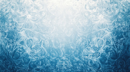 Frosted Patterns. Close-up of intricate icy frost patterns on a surface, predominantly blue hues.