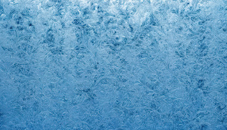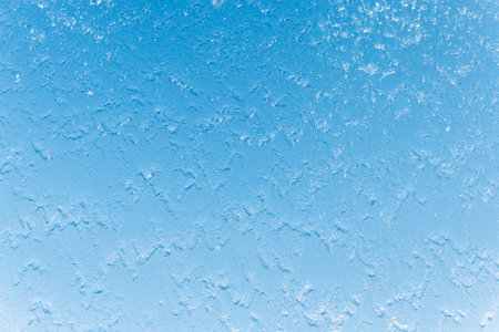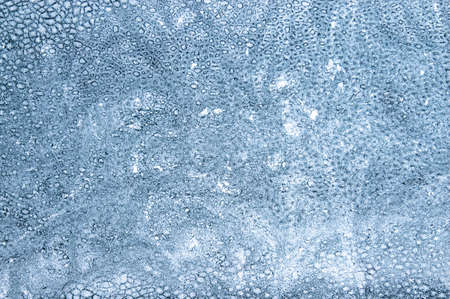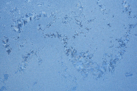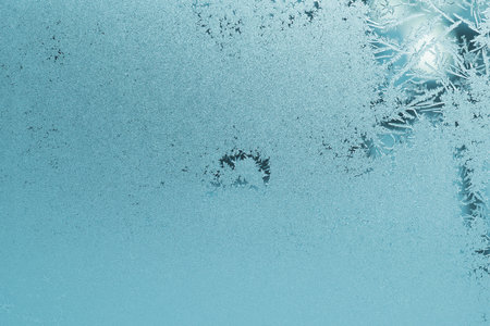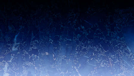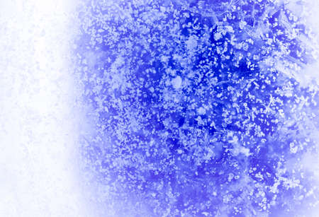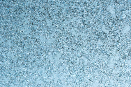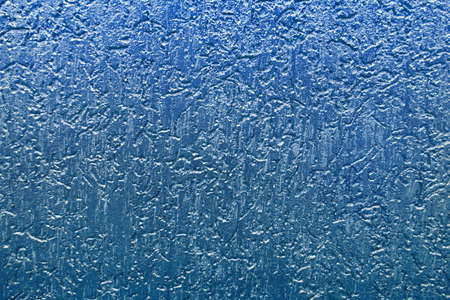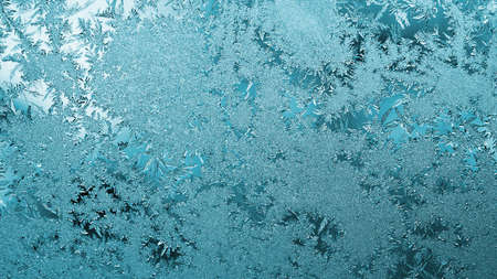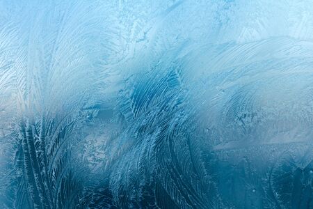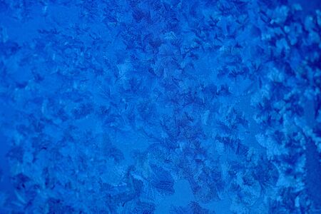 Ice and frost on a window pane in winter. Weather forecast: cold, frost, cooling. Abstract background or wallpaper in bright blue. reduced weakened contrast. Harsh season