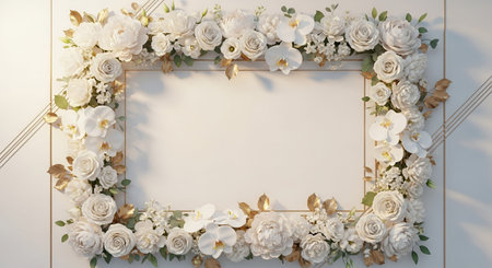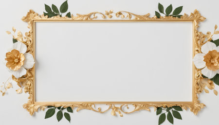Ornate gold frame adorned with delicate peach and white flowers creates a luxurious and romantic aesthetic Great for invitations or presentations.