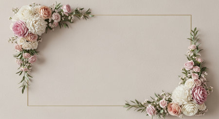 Flowers composition. Frame made of rose flowers on pastel beige background. Flat lay, top view, copy space
