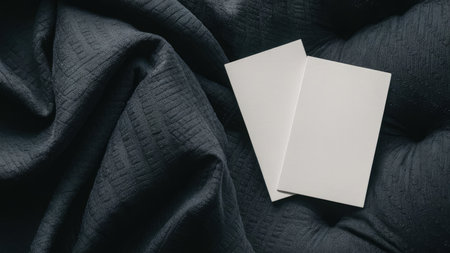Mockup of a fanned stack of business cards on a white textured paper background, high-angle shot, minimalist style