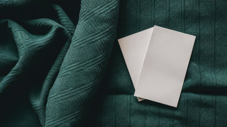 Two empty business cards rest on a textured knitted sweater, complemented by pine branches and red berries, evoking a warm and inviting winter setting.