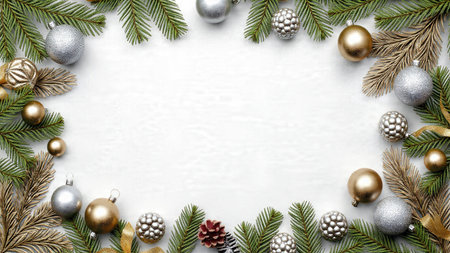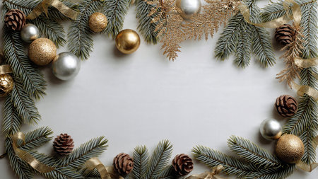 A soft, bright holiday frame enriched with pine and metallic details arranged neatly along the edges.