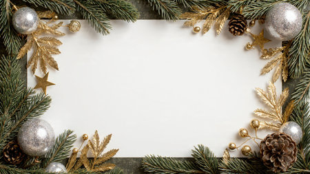A calm white center bordered by pine greenery and sparkling gold-and-silver ornament clusters.