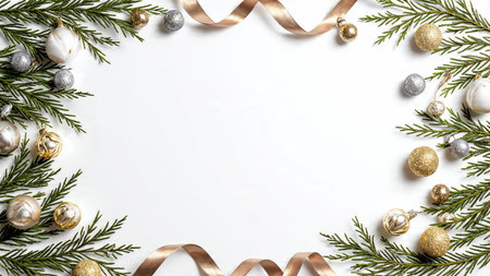 A clean holiday composition with lush pine needles and metallic ribbons arranged around a blank, glowing white space.
