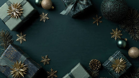 Christmas background with gift boxes and decorations on dark green background, top view
