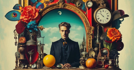 Handsome young man in black suit and bow tie sitting at the table with pumpkins and vintage clock
