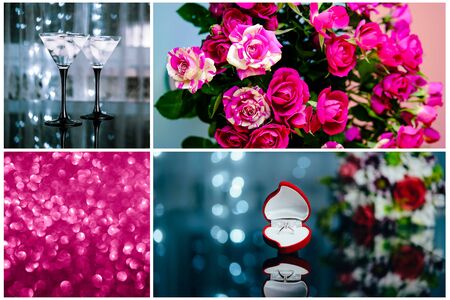 Beautiful valentine's day collage. Love and romantic concept. Flowers, engagement ring, dinner for lovers.