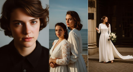 Collage of three photographs featuring young adults in formal wear, including a close-up of a man in black, two women in white dresses by the ocean, and a woman in a wedding dress with a bouquet in a city setting.