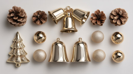 Celebrate the holiday spirit with this beautiful arrangement of golden Christmas decorations, featuring bells, shiny ornaments, and pine cones for a festive touch.