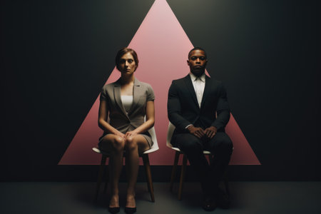 Two women in black suits share a passionate kiss, their human faces adorned with stylish clothing, showcasing the perfect blend of power and sensuality in modern fashion