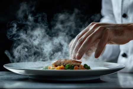 Exquisite gourmet dish presented on a fine dining plate, adorned with vibrant colors, delicate garnishes, and an artistic smoke effect for culinary photography