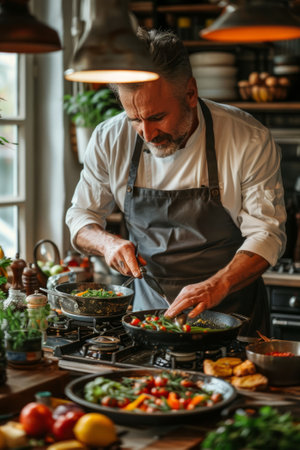 Mature man in apron attentively cooking on stove, surrounded by kitchen tools and fresh ingredients. cooking at home concept