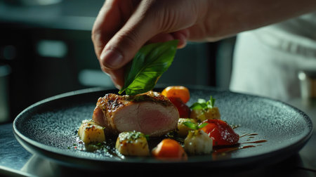 A chef skillfully garnishes a gourmet dish with fresh basil in a professional kitchen, showcasing culinary art and vibrant ingredients for an exquisite meal.
