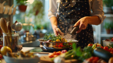 woman gracefully prepares food in her kitchen, chopping vegetables and stirring pots with precision and focus as she creates a delicious meal.
