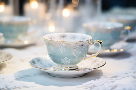 Winter themed tea party setup with snowflake patterned teacups and saucers. Generative AI illustration