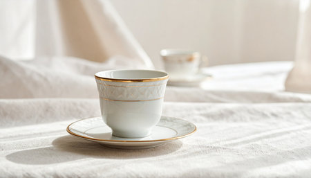 Sunlight streams through a delicate curtain, illuminating a pair of elegant porcelain teacups on a crisp white tablecloth.