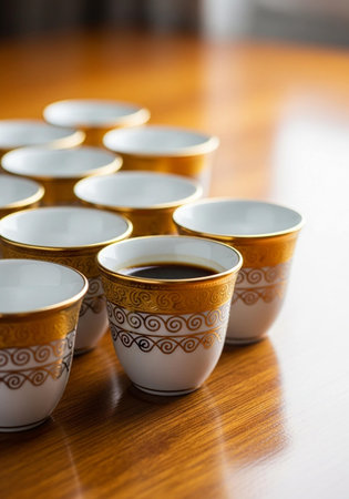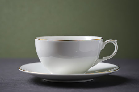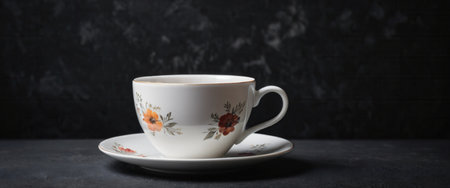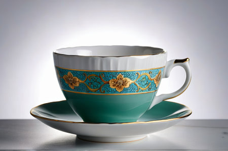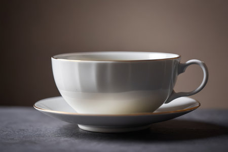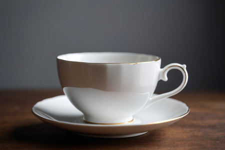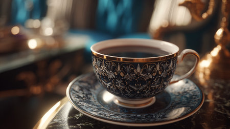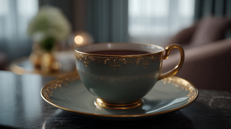 A luxurious tea cup and saucer on a dark table in a cozy room