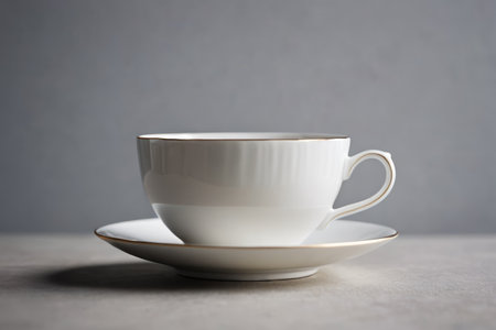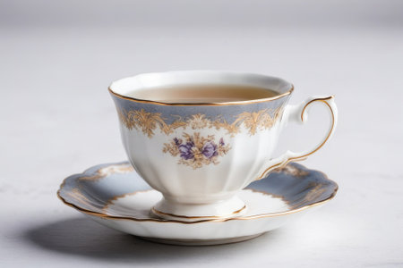 A delicate tea cup with gold trim sitting on a matching saucer in a cozy setting