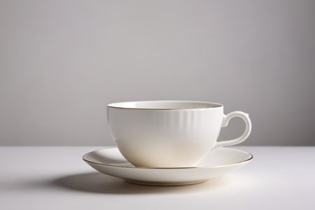 A delicate white teacup with gold trim sits on a matching saucer on a table