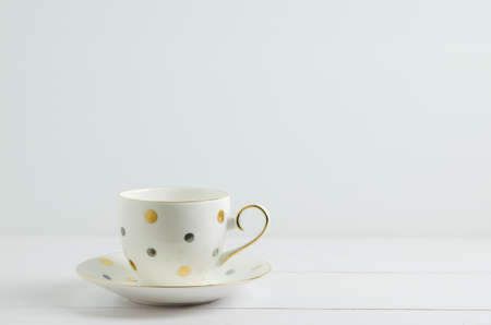 Close up of vintage coffee cup with cute dot pattern on white wooden background
