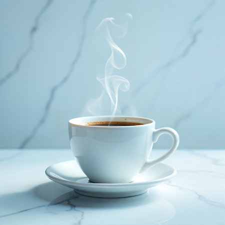 Steaming Hot Coffee Cup on Marble Table Morning Drink
