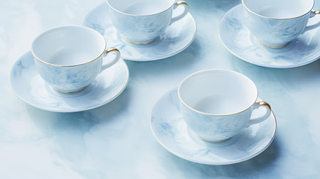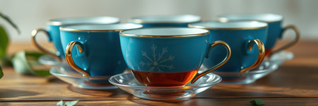 Elegant blue teacups arranged on a wooden table with warm tea and delicate saucers during a serene afternoon