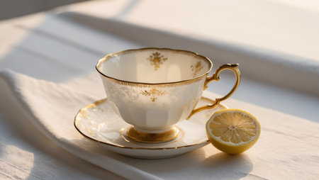AI Generated. Ornate Teacup With Lemon Slice in Sunlight