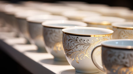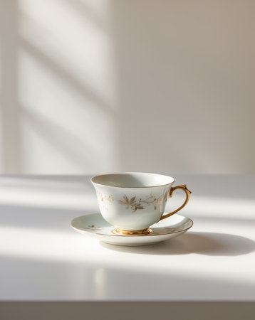 A luxurious white and gold teacup on a matching saucer sits on a marble table in a modern room