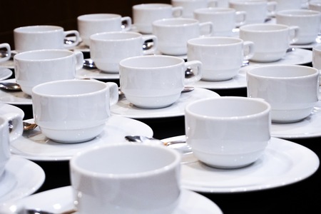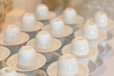 many white empty coffee cup preparation for coffee break of wedding event,selective focus.
