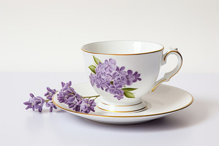 Delicate Lilac Blossoms Grace a White Cup on a White Saucer -- Captivating 3:2 Artistry