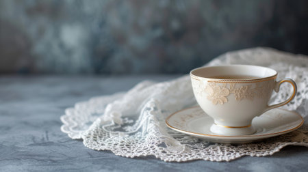 Vintage styled teacup on a delicate lace doily over a textured surface