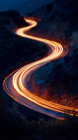 curved road with light trails at night, mesmerizing view. urban transportation and speed concept