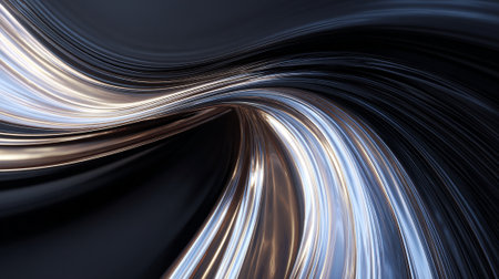 This abstract artwork showcases a series of flowing lines in shades of gray, white, and gold, creating a dynamic visual effect. The composition employs a sense of movement with its curves and undulations, enhanced by the interplay of light and shadow. Suitable for various design applications, the image could serve in digital media projects.