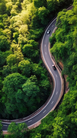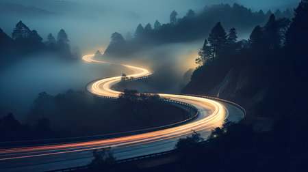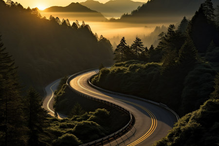 The sun's first rays illuminate a winding road through a misty mountain forest, creating a tranquil and enchanting morning scene. Generative AI