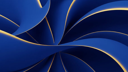 Deep blue abstract shapes with flowing golden edges create a dynamic swirling motion against a dark background.