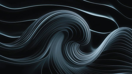 An artistic rendering of flowing, wave-like forms, characterized by intricate lines and a play of light and shadow, creating a sense of depth and movement.