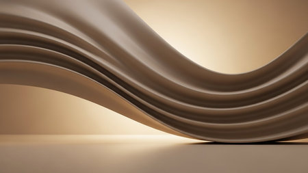 An abstract composition features a smooth, flowing wave of fabric with gentle curves and soft lighting. The neutral beige and brown tones create an elegant and minimalist background with subtle shadows and highlights.