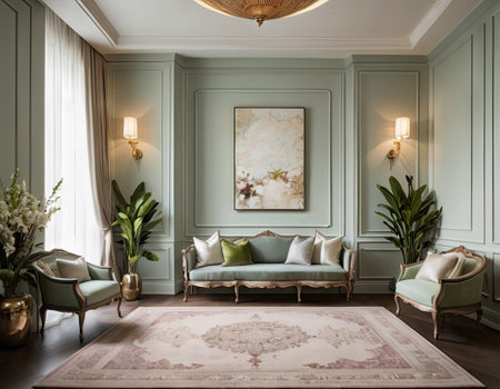 Luxury interior of the living room in classic style. The room is decorated with green furniture.