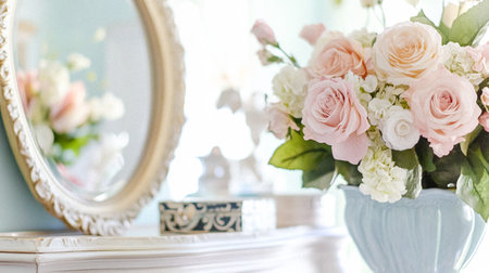Vase with flowers on the white chest of drawers in the room