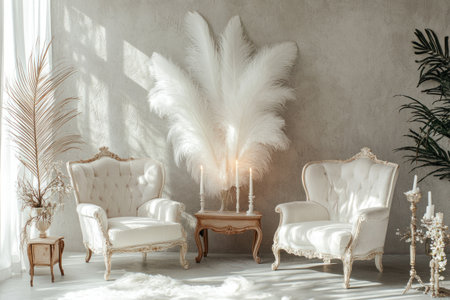White feathered armchairs and large white feathers in the center of an elegant room with candles, plants, and sunlight. Minimalist interior design concept for home decor. --ar 3:2 --v 6.1 Job ID: 312b4a89-7a02-40b5-aa29-8bcb6282ad85