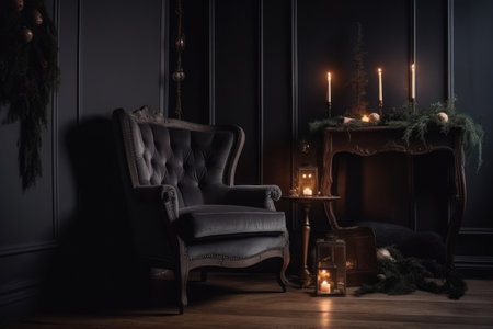 Luxury living room with armchair, fireplace and christmas decorations, Generative AI