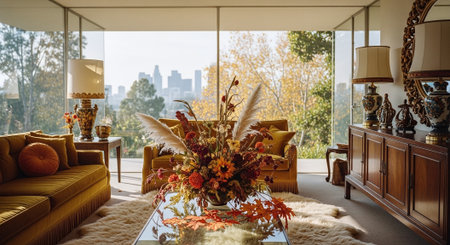 A cozy living room with a large floral centerpiece, warm autumn colors, plush sofas, and a decorative fireplace