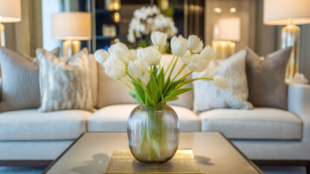 A beautifully arranged living room featuring white tulips in a modern vase, complemented by soft pillows and warm lighting, creating a cozy, inviting atmosphere.