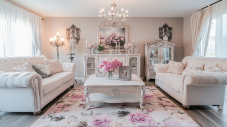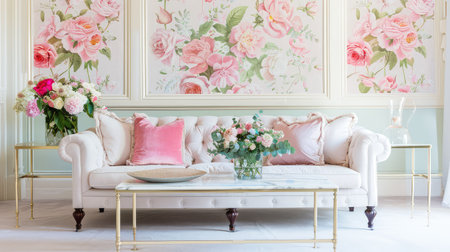 This stunning interior design showcases an elegant pink living room, adorned with floral arrangements and luxurious furniture, creating a warm and inviting atmosphere.