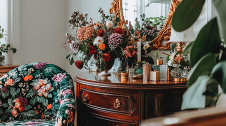 , slightly shadowed interior scene showcasing a dark, richly patterned floral armchair next to a highly polished, dark wood console table. The table holds a large, dramatic arrangement of dark and colorful cut flowers, several bottles of fragrance, a candle, and is backed by a large, gold-framed mirror that reflects the abundant blooms. Large green foliage in the foreground partially frames the right side of the composition, adding depth.
